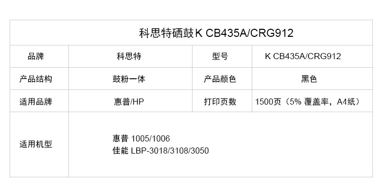 科思特CB435A黑色硒鼓 适用惠普P1005 P1006 CRG912 LBP 3108 3018 专业版