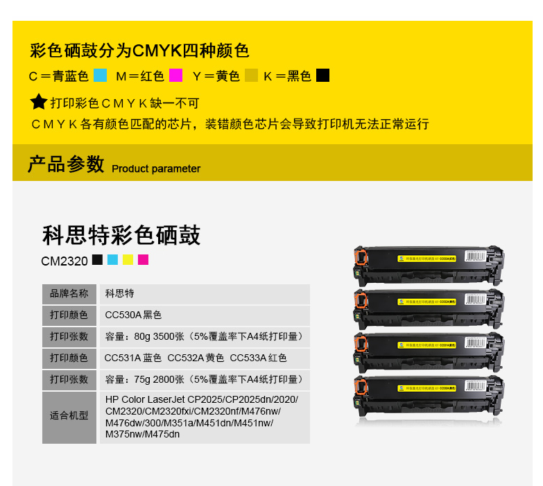 科思特CC532A/CF382A/CE412A 硒鼓 适用惠普 CP2025 CM2320 M476nw M351a M451dn 黄色 专业版