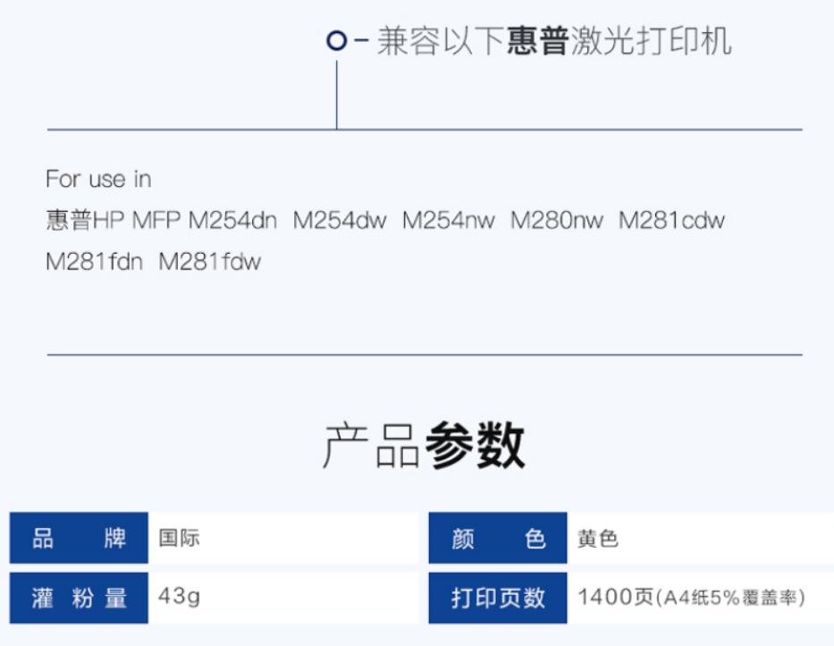 国际 CF502A 黄色 硒鼓 适用于惠普HP Colour LaserJet Pro M254dw M254nw M280nw M281fdw M281fdn G10758