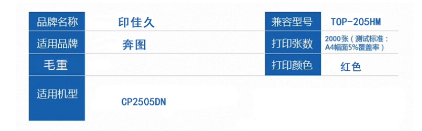 当前位置:首页 > 办公用品-硒鼓、粉盒-墨粉盒 > 印佳久 TOP-205HM 红色碳粉 适用 CP2505DN