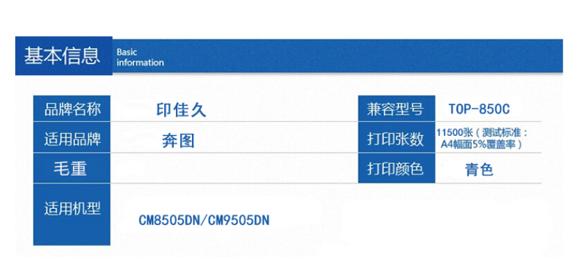 印佳久TOP-850C 青色粉盒 适用于奔图CM8505DN/CM9505DN