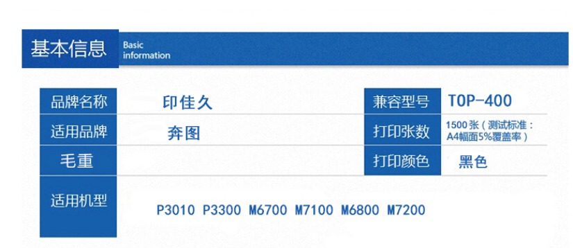 印佳久TOP-400 黑色粉盒 适用于奔图P3010/P3300/M7100/M6800/M7200