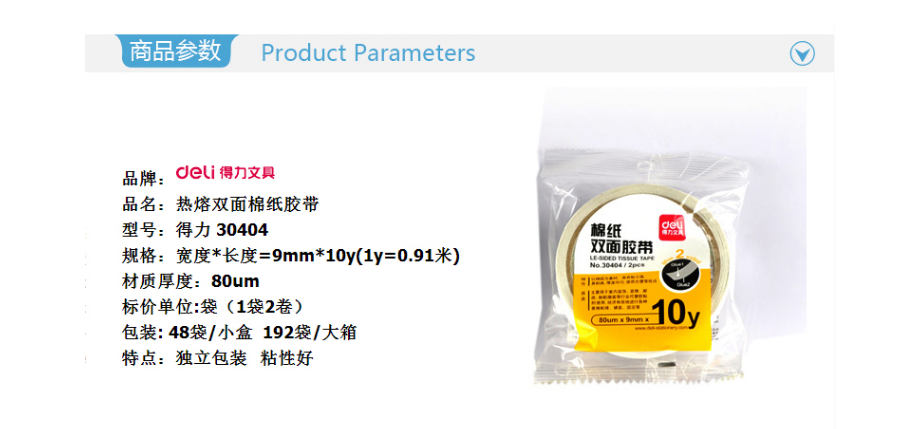 当前位置:首页 > 办公用品-文教用品-文具 > 得力(deli) 高粘性棉纸双面胶带 30404 (9mm*10y)2卷/袋 48袋/组
